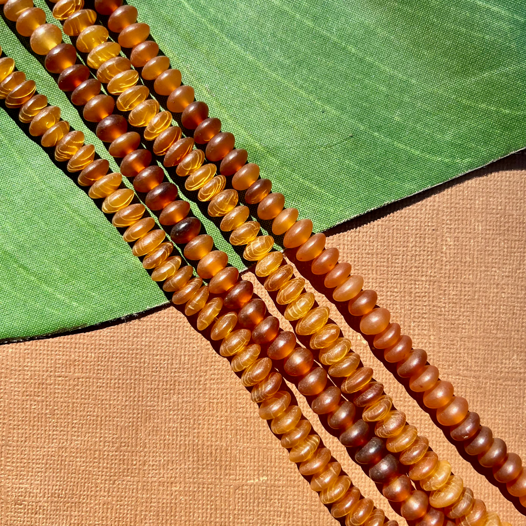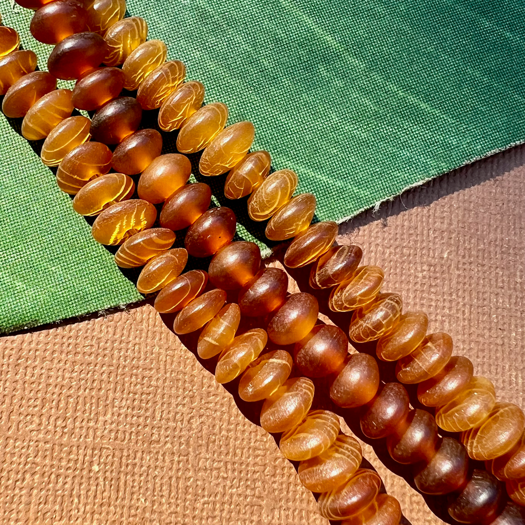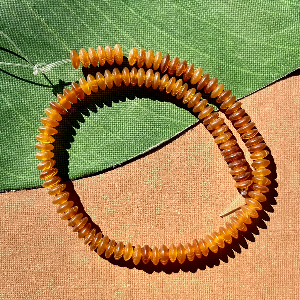 Golden horn rondelles. A lovely golden color of horn from the Philippines. Some strands with original vintage “made in Philippines” tag. Thank you Mr water buffalo for lending us your horn. Rich and beautiful, like these horn beads, is the only way to go through life.