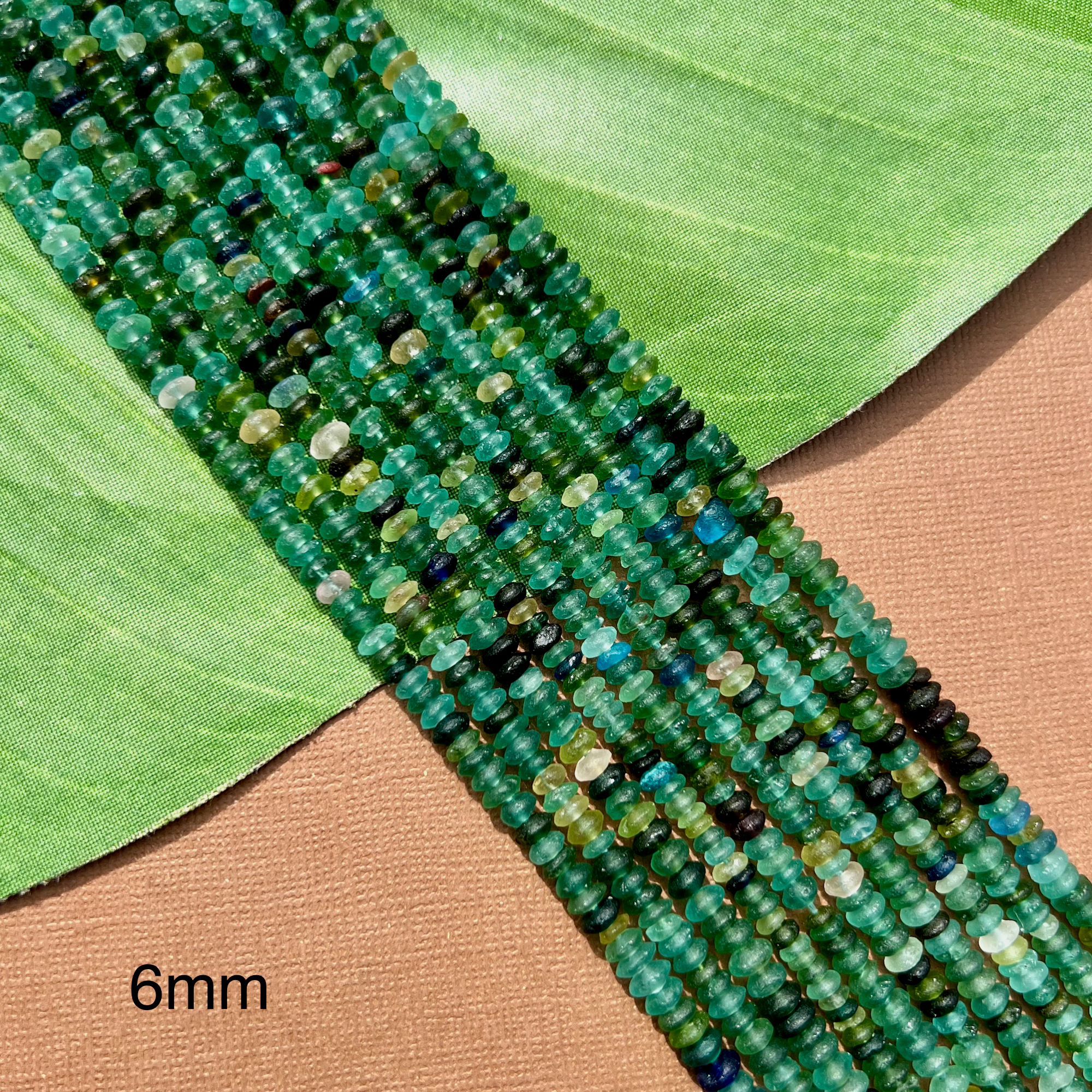 Ancient silk road glass is found along the old trade route known as the Silk Road. Silk road glass is often referred to as Roman Glass. Strands are temporarily strung.
