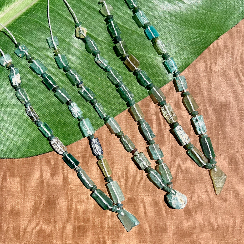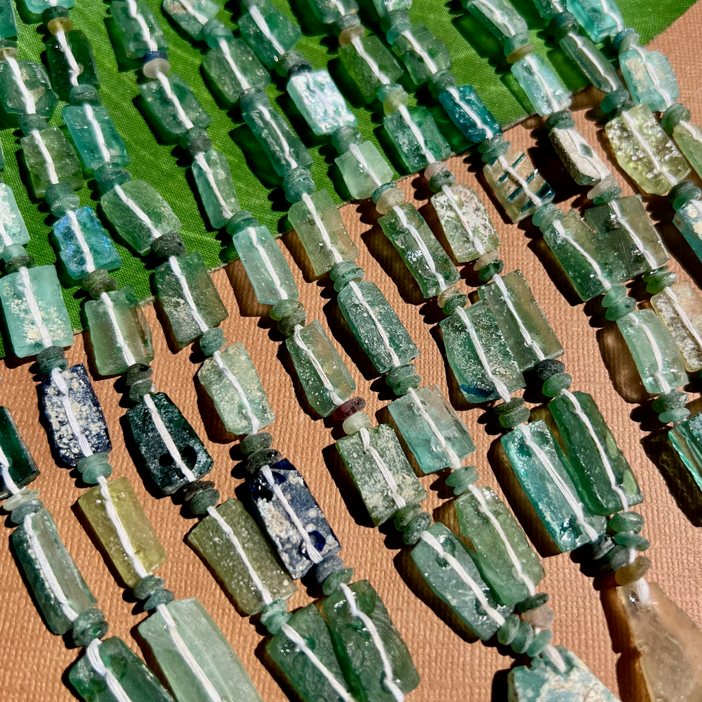 Ancient Silk Road glass is found along the old trade route known as the Silk Road. Silk Road glass is often referred to as Roman Glass. Strands are temporarily strung.