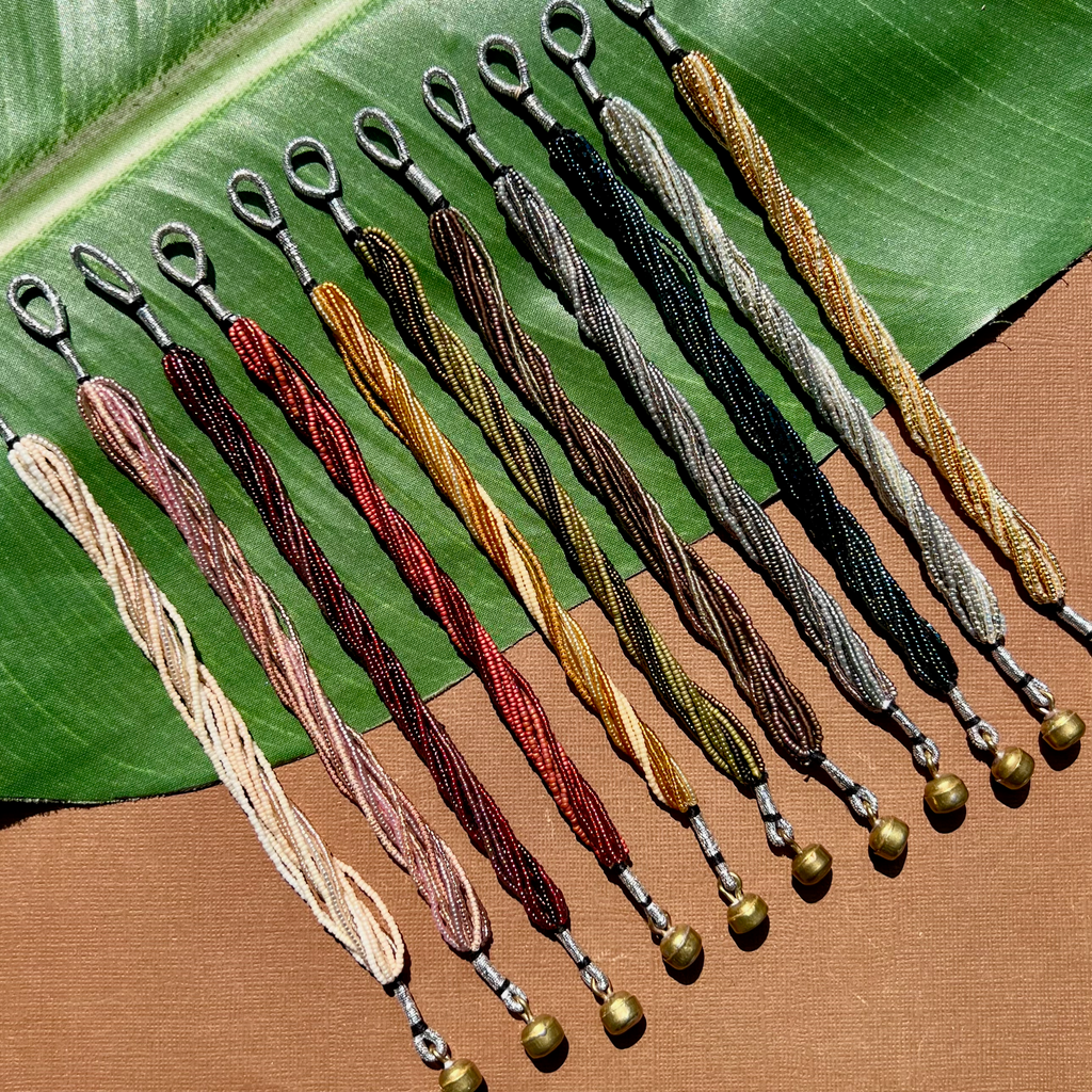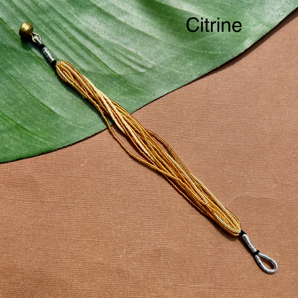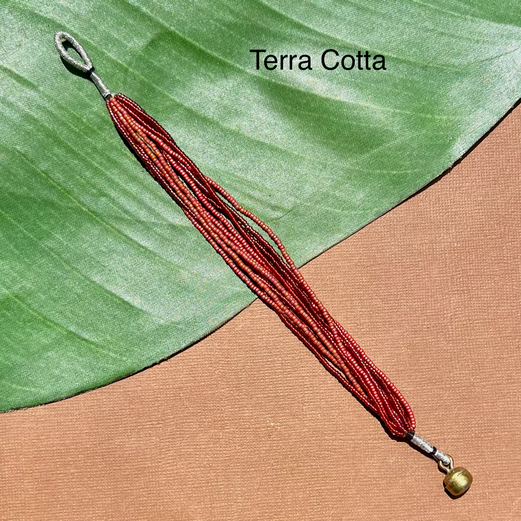 Seed Bead Bracelets are made in Nepal with Miyuki size 15 Japanese glass seed beads. 12 strands are strung together and finished with a lotus button clasp.