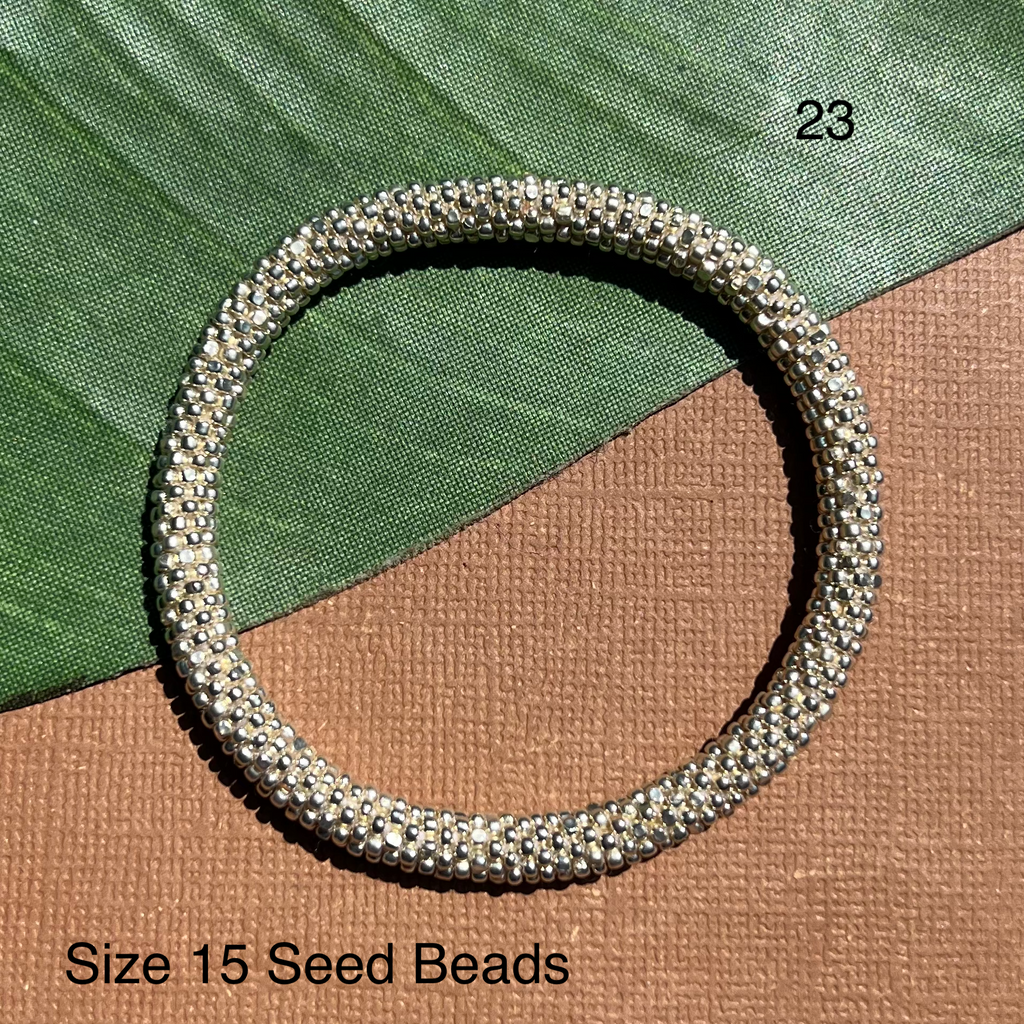 The seed bead sizes are either Size 11 or Size 15. Size 11 is a larger bead than size 15. The number refers to how big the bead is, the larger the number the smaller the bead. Though not always precise, the number of beads is how many beads fit into 1 inch. A size 11 means that roughly 11 beads fit into 1 inch.