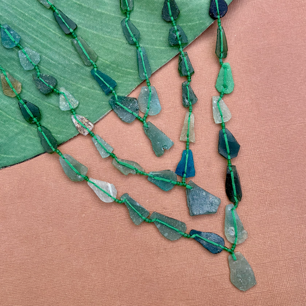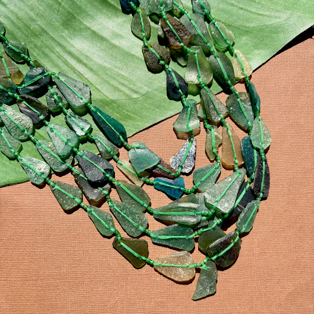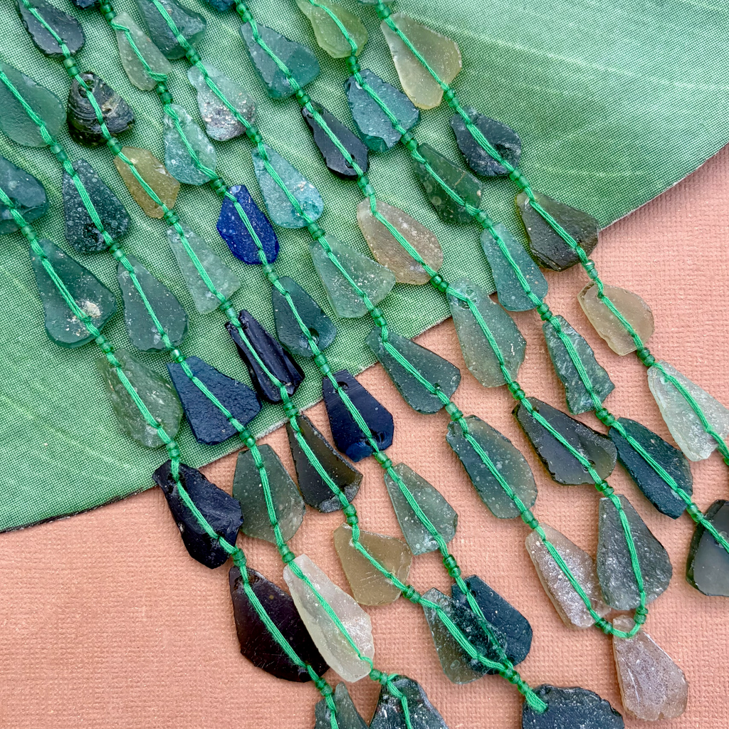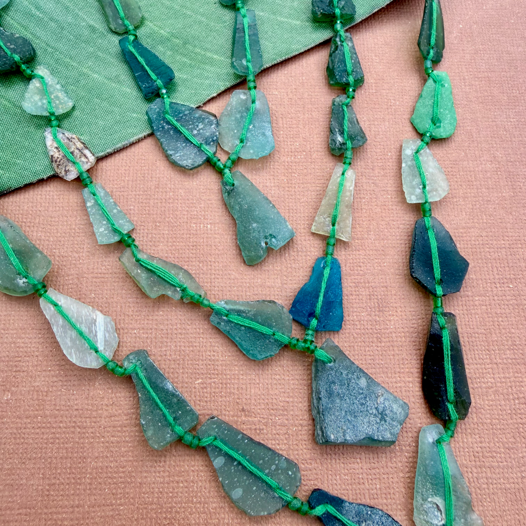 Ancient Silk Road glass is found along the old trade route known as the Silk Road. Silk Road glass is often referred to as Roman Glass. Strands are temporarily strung.